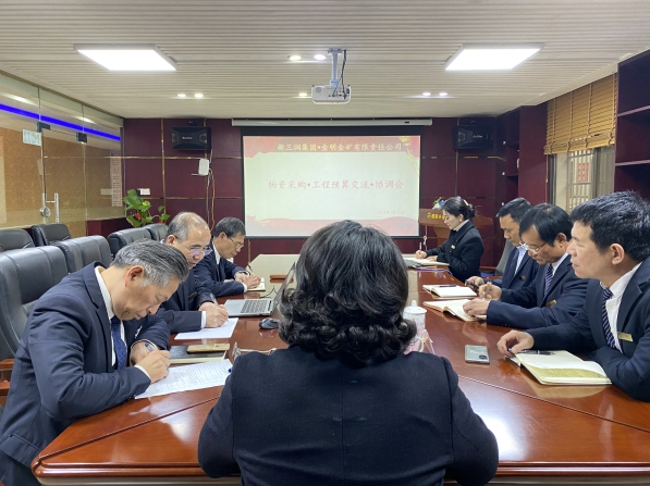 2022年3月21日13:00时,金明金矿物资采购、工程预算交流协调会在醴陵分部第一会议室召开,金明金矿总经理肖玲兰、财务总监王国中、矿长黄朝根、选矿厂厂长马世甫、矿业发展部常务副总监杨建华、行政总监黎诗露,集团工程预算部总监张荣、采购供应部副总监肖顺清共计7人参加了会议。本次会议由总经理肖玲兰亲自主持。