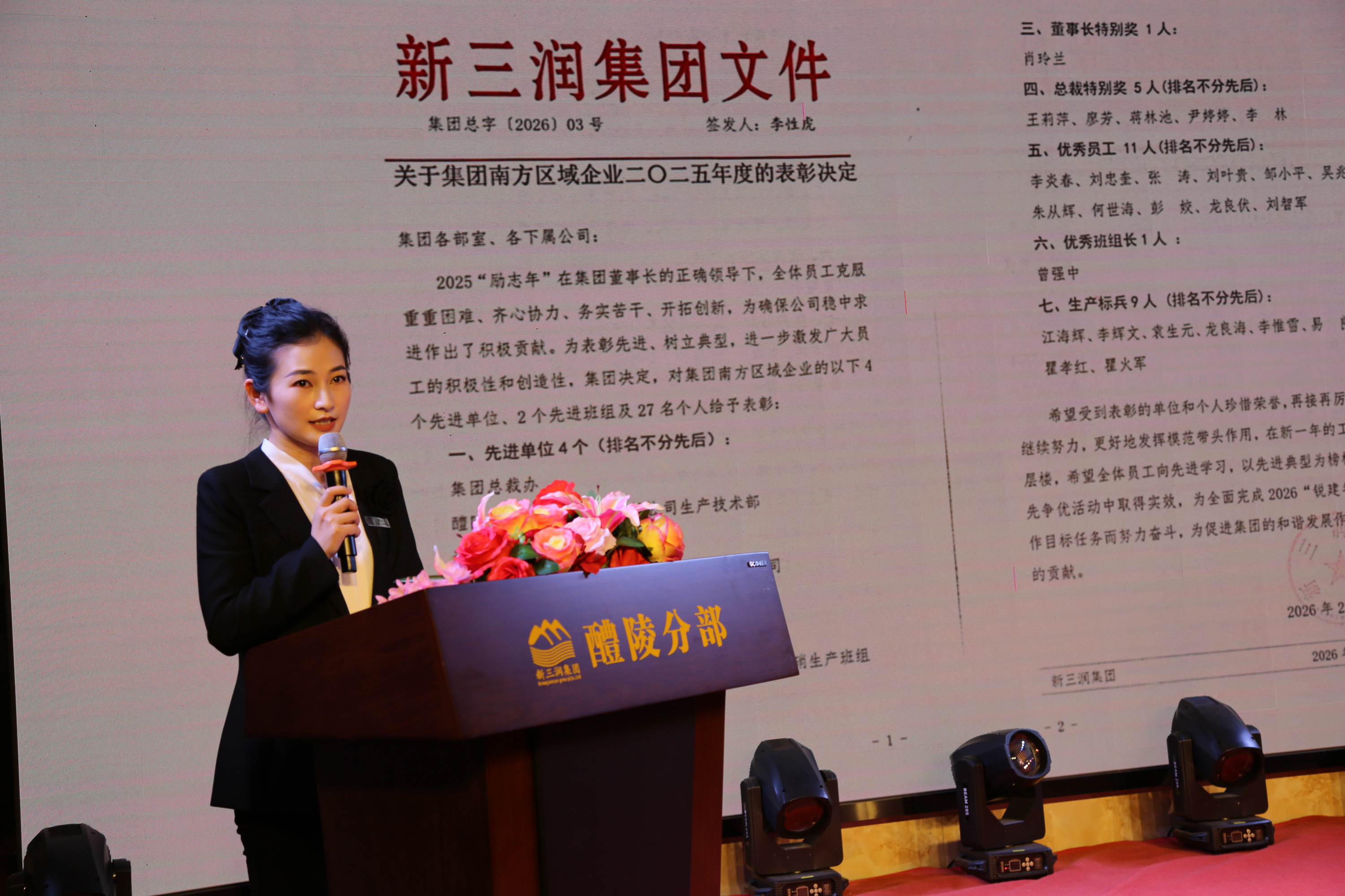 活动由集团总裁办常务副主任蒋林池、助理主任尹婷婷联袂主持。集团副总裁肖玲兰致开幕辞,号召全体同仁以“锐建者”的冲锋姿态奔赴新征程。随后,集团副总裁周嘉豪代为宣读《总裁工作报告》。报告系统总结过去一年攻坚破局、逆势奋进的亮眼成绩,并锚定百亿蓝图与2027投产目标,正式发布2026“锐建年”的攻坚任务——“五个必须”。