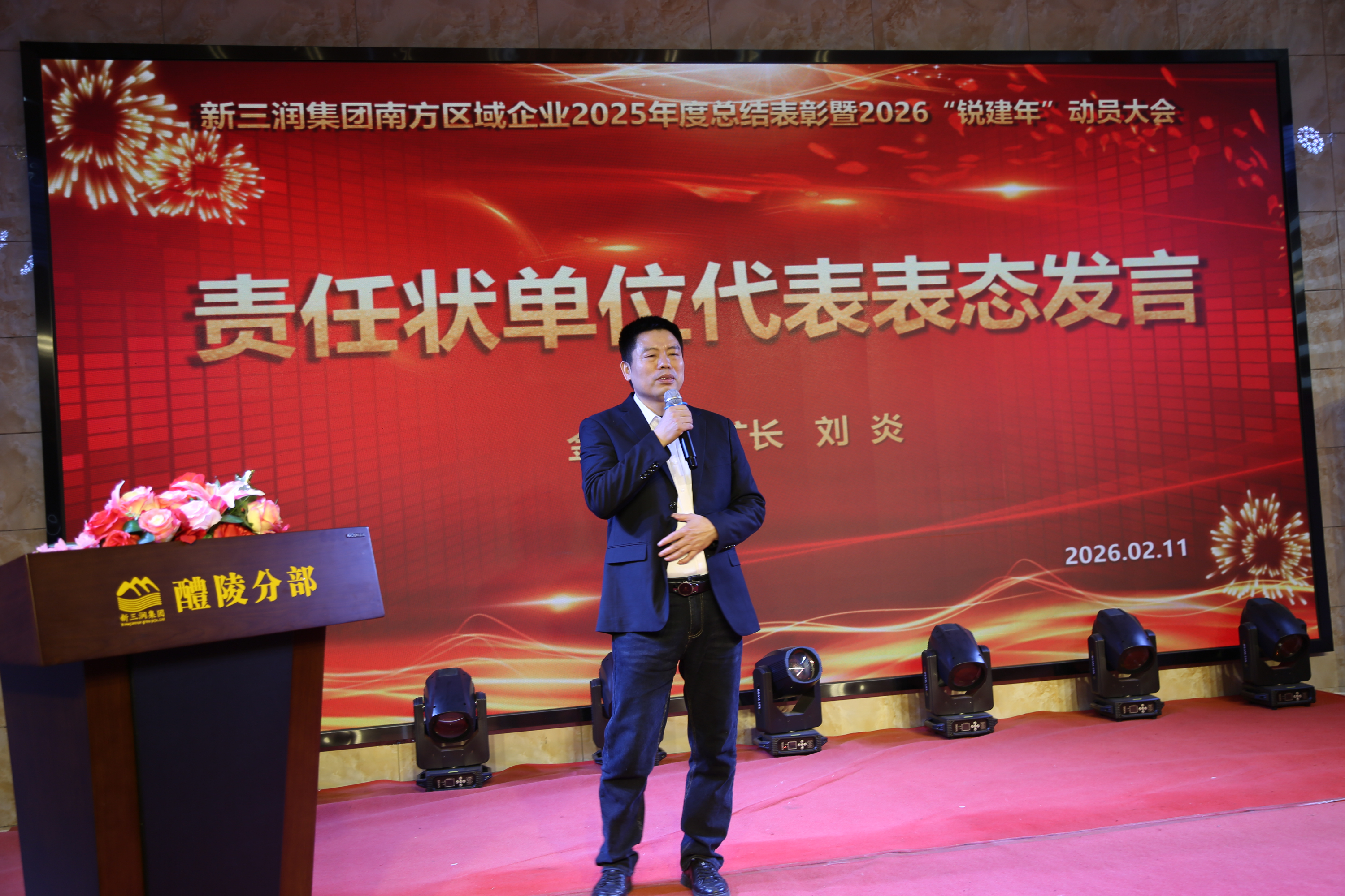新员工代表龙方平、家属代表刘军和周化晴、离职员工代表姜雪、观察员代表宋军、股东代表瞿孝军、蒋申慧先后发言。台上台下,真情涌动——这里是事业平台,更是有情有义的温馨家园。董事长向各单位负责人现场颁发2026年度目标管理责任状,金顺矿业矿长刘炎作为代表郑重表态:以“开战即决战”的状态,誓夺2027投产目标的全面胜利。