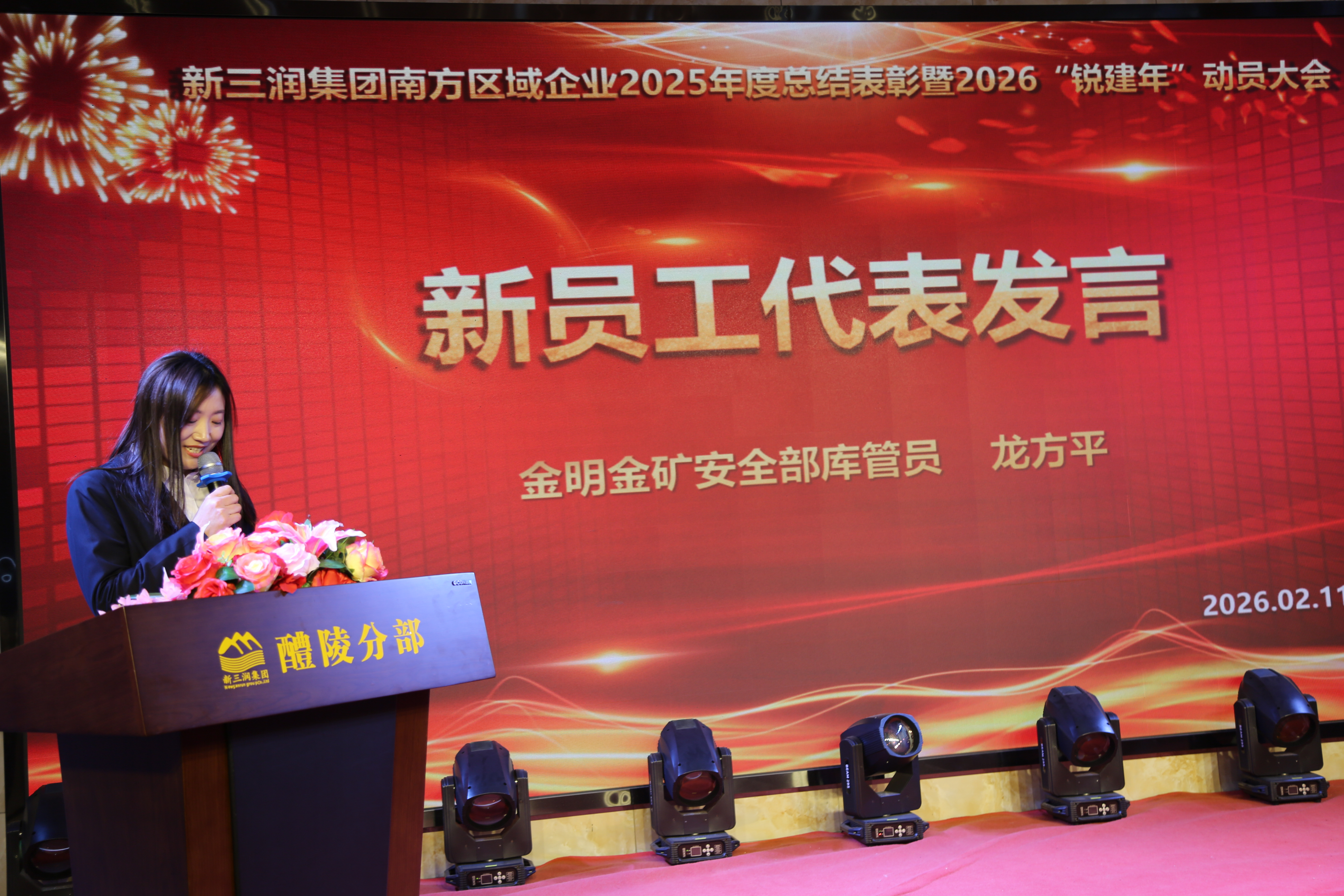活动由集团总裁办常务副主任蒋林池、助理主任尹婷婷联袂主持。集团副总裁肖玲兰致开幕辞,号召全体同仁以“锐建者”的冲锋姿态奔赴新征程。随后,集团副总裁周嘉豪代为宣读《总裁工作报告》。报告系统总结过去一年攻坚破局、逆势奋进的亮眼成绩,并锚定百亿蓝图与2027投产目标,正式发布2026“锐建年”的攻坚任务——“五个必须”。